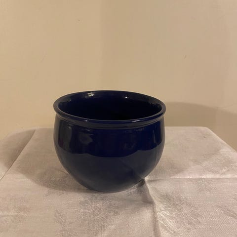 Flott keramikkbolle i nydelig lyseblå farge. Pen og blank i glasuren. Signert under, men gjenkjenner ikke signaturen. Høyde 7 cm, diameter 18 cm.