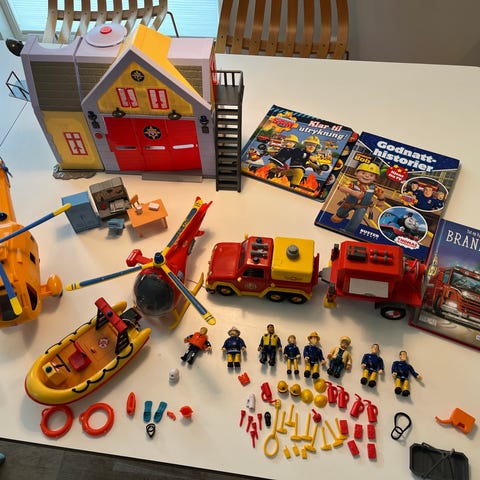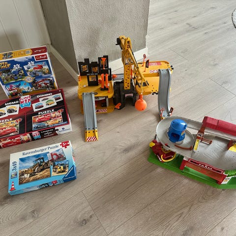 Ravensburger Vildkatten og My First Puzzles barneleker inkluderer puslespill og lekesett for barn fra 2 år. Vikingtid brannbil med to figurer. Brio bondegård med alle deler, men mann har synlige bruksmerker. Garasje og kranbil fra IKEA. Elefant krittavle. Produktene er designet for små barn og inneholder flere elementer som puslespill med dyremotiver og forskjellige leker i fargerike materialer.