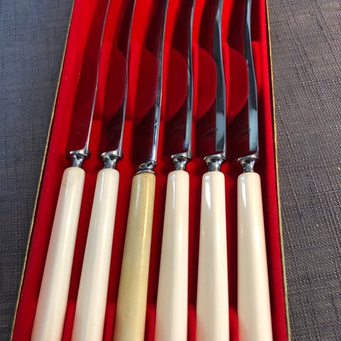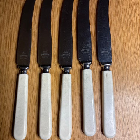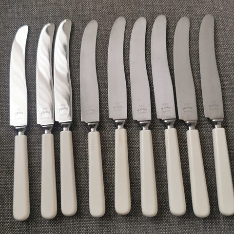 Knivene har hvite håndtak og er ca 23 cm lange.