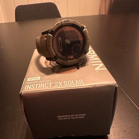Garmin Instinct Solar 2 i sort farge. Klokken har en robust design med silikonrem. Den har solcelle panel som betyr at den kan lade seg selv. Batteritiden er betydelig bra på denne modellen.