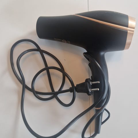Hårføner i svart farge. Elektrisk hårføner med ledning, egnet for personlig pleie og hårstyling.