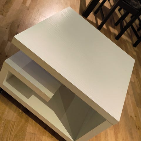 Lite bord i tre. Lakkert. Lite hakk ene kanten som på bilde. 38x52 i bordflata og 52 høy.