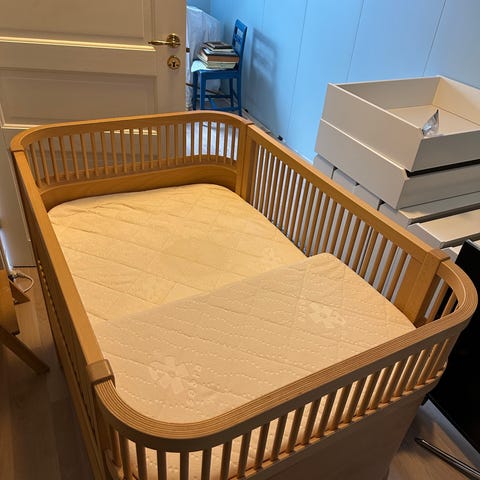 Sengene er pent brukt, med normal bruksslitasje. Flere bilder kommer. Det medfølger madrasser om ønskelig, til både baby- og juniorseng. Samt bjelker for å kunne heve babysengen, veldig praktisk til små nyfødte, og skånsomt for rygg. Jeg tror det mangler en skrue eller to, uten at det merkes eller har noe å si for funksjon. Kom gjerne å ta en titt.