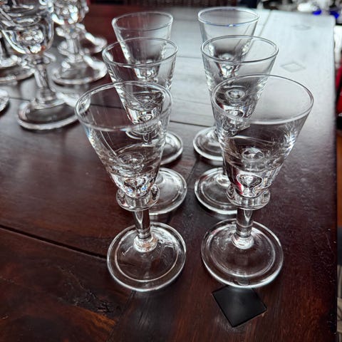 Hadeland Glassverk Furu glass i klart glass. Seks delikate hvitvinsglass med stilisert design, egnet for servering av drikke. Nydelige Furu fra Hadeland Selges helst samlet. Ut fra tidligere dårlige erfaringer, ønsker jeg ikke å sende så skjørt og tynt glass i posten.