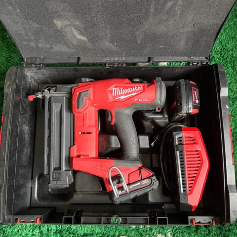 Milwaukee M18 Fuel spikerpistol (M18 FFN-502C) med kapasitet for 90 mm spiker. Verktøyet har funksjoner som null oppvarmingstid, ingen gasspatron og to moduser for bruk. Passer for spikring i hardtre og leveres i oppbevaringskoffert.