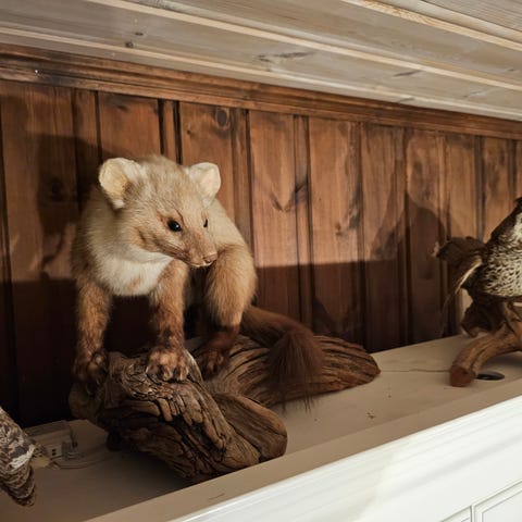 Utstoppet mår på trestamme. Dyret er fint og helt. Kan sendes.