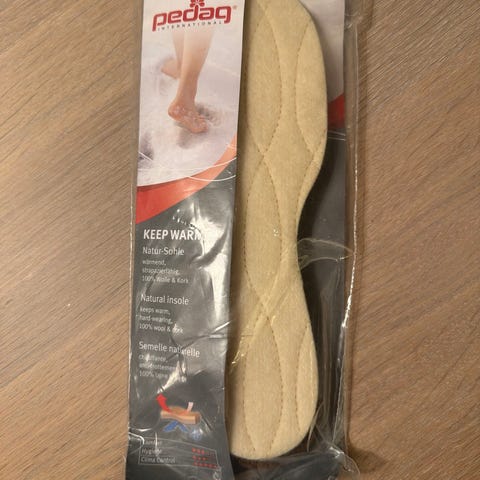 Sålinnlegg i ullfilt beige og grå. Designet for å gi ekstra komfort og isolasjon i sko. Kan brukes i ulike typer fottøy for å forbedre passform og demping.