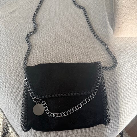 Hvit skulderveske i kul asymmetrisk design. Kjøpt fra Tise. Finnes et merke bak som jeg ikke får bort (se bildet nr 2). Justerbare skulderstropper.