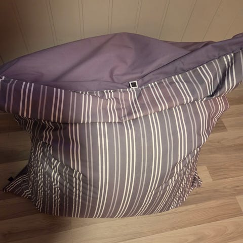 Pent brukt sakkosekk i svart lærimitat. Ca. en meter lang og kan passe til en voksen. Trolig kjøpt på Møbelringen for ca. 15 år siden.