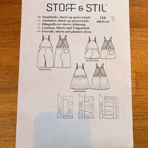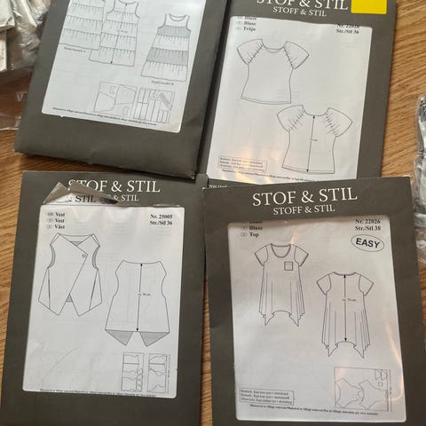 Stoff & Stil syoppskrifter for barneklær i størrelse 86, 92 og 98 cm. Inkluderer mønstre for body med nederdel, body med skjørt, bukse og T-skjorte. Oppskriftene er tilpasset enkel søm og klærne syes i stretch/jersey. To av pakkene er aldri åpna.