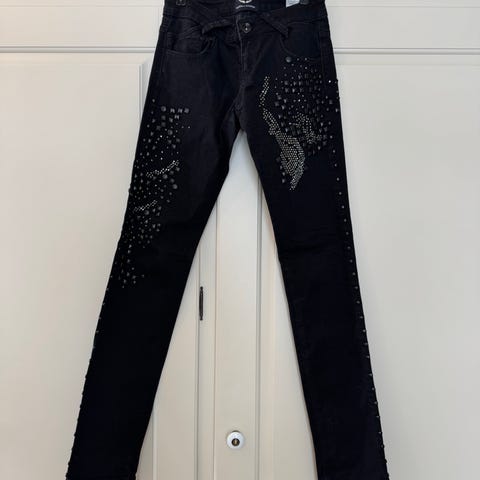 Munthe bukser i størrelse 38 for kvinner, laget av polyester. Bukser i svart farge med dekorative detaljer/hull. Sommerbukse