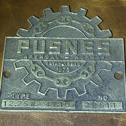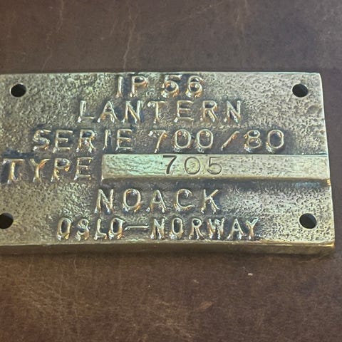 Messingskilt fra Nor Davit, Mjølner Industrier, Bergen. Brukt på maritimt utstyr.