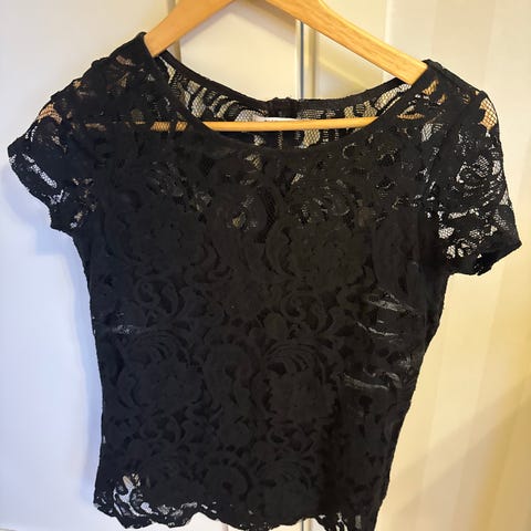 Lanrmeløs topp (singlet/tanktopp) med scoop-hals og en dekorativ blondekant nederst.