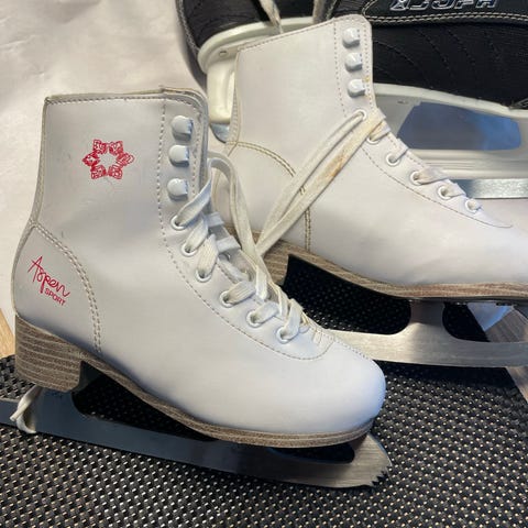 Kustløp skøyter størrelse 35 med hvit farge. Skøytene er egnet for skøyting og har tradisjonelt design.