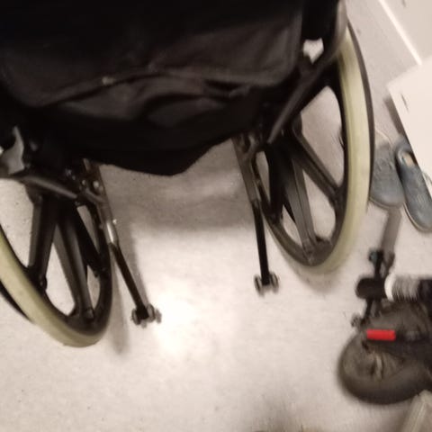En liten og hendig rullestol selges. Den er veldig smal i forhold til vanlige rullestoler (ca 40 cm bred), og med armelener som kan vippes bort. Stolen er godt brukt, med noen synlige merker.
