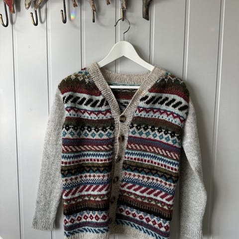 Hvaler cardigan fra knitteriet. Strikket i originalgarn, flere typer mohair. Er str.S, men passer fint en M og L også - avhengig av hvordan du vil den skal sitte. Til referanse (bildet) bruker jeg str.40- og M/L. Brukt to ganger, er som ny. De to siste bildene er lånt