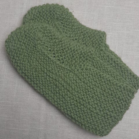 Hjemmestrikkede tykke ull tøfler i str 42 - 45 (unisex). Farge grønn/sort og er som nye. Her holdes en varm.