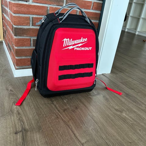 Milwaukee Packout verktøyveske og oppbevaringsbokser i svart og rød farge. Sett bestående av flere moduler for oppbevaring og transport av verktøy og tilbehør. Materiale og størrelse er egnet for organisering og beskyttelse av verktøy i ulike arbeidsmiljøer.