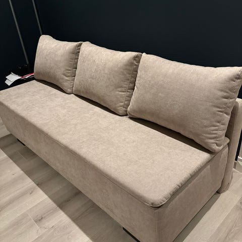 Lett, praktisk og god sovesofa. Pall på undersiden trekkes fram og så er det bare å re opp.