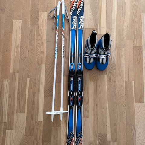 Rossignol Frost langrennsski med tilhørende staver. Skiene har bindinger montert og er utstyrt for klassisk langrenn. Staver er tilpasset skiens lengde og bruk. Passer til langrennsløpere som ønsker utstyr for klassisk stil.
