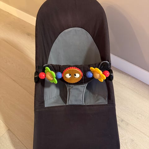 Babybjörn vippestol i sand Grey. Nesten ikke brukt, fremstår som ny. Selges med leker, i pastel farger.