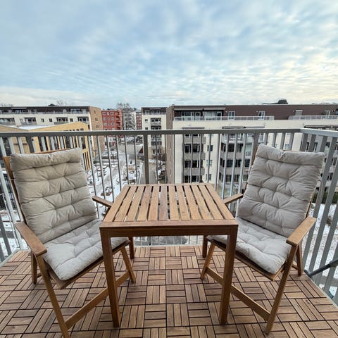 To hagestoler og fotstøtte med grønne puter med slitesterkt stoff.
