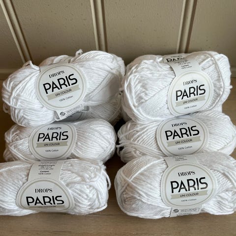DROPS Paris garn laget av 100% kammet bomull. Garnet kommer i fargene gul og hvit, med en vekt på 50 gram per nøste. Passer til strikkepinner størrelse 5 mm, med strikkefasthet på 17 masker x 22 rader per 10 x 10 cm.