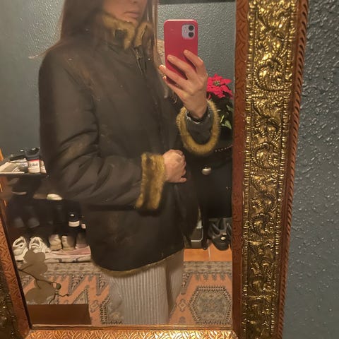 Selger en pent brukt jakke. Grønn farge med pels.