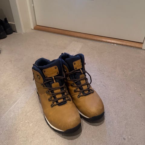 Timberland vinterstøvler i størrelse 43. Støvlene har robust yttersåle med godt grep, og er designet for bruk i vinterforhold. Materialet ser ut til å være slitesterkt og egnet for kaldt vær. Et lite bruksmerke på høyre skoen, men man legger ikke merke til det.
