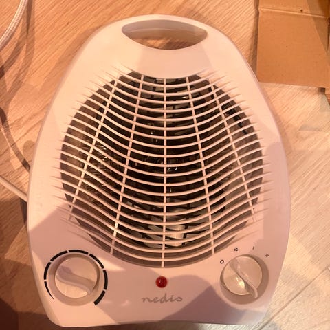 Electrolux varmeovn i hvit farge med kontrollknapper for innstilling av varmeeffekt og vifte. Fungerer som den skal. Selv har jeg brukt den til oppvarming av soverom på 15 kvm. Usikker på originalpris.
