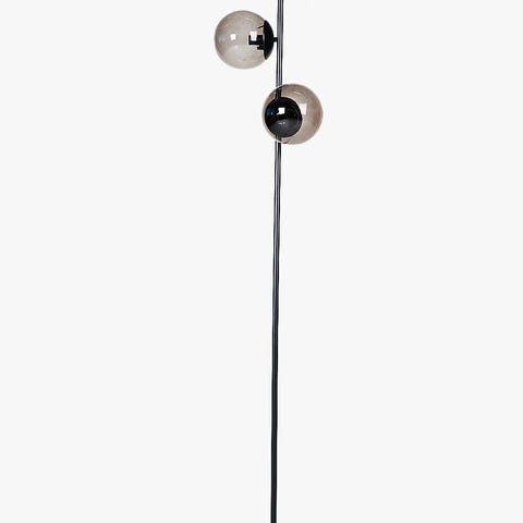 Dette er gulvlampe med svart lampearm i metall, med tre runde lampeskjermer i sotet munnblåst glass. Stilig lampe som er 154 cm høy.
