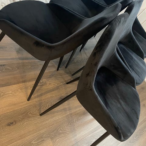 Pent brukte stoler. Det er 6 stk. De heter Venture Home, og er fra Ellos.