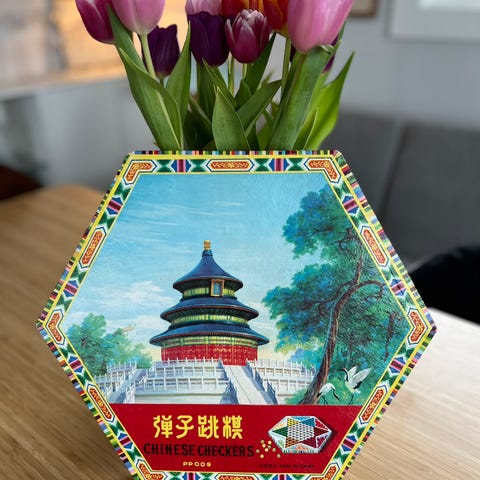 Wooden Classic Chinese Checkers brettspill laget i tre. Det er ca like stort som en hånd og ideell til å ta med på reise.