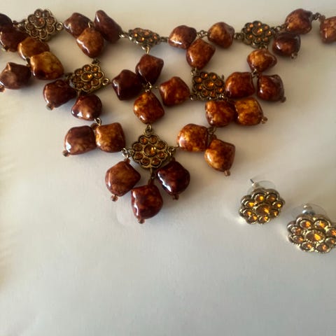 Knallfint smykkesett fra 50-årene. Komplett med smykke og øredobber i originalemballasje. Smykket kan tas av lenken og brukes som nål. Øredobbene skrus på. Baksiden på siste bilde. Settet ser nærmest ubrukt ut, i fantastisk vintage stand.