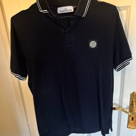 Stone Island Slim Fit polo t-skjorte i størrelse M, laget av bomull. T-skjorten har en grå farge og er designet for menn. Den har klassisk krage og knappelukking, med Stone Island-logo på brystet