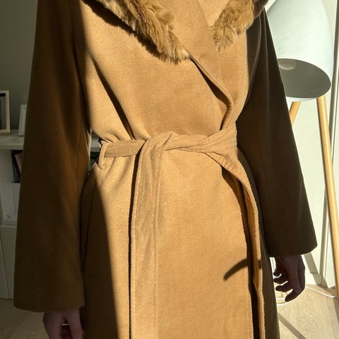 Lett og pen kåpe fra H&M. Pene detaljer på armene. Knelang modell. Hvit/kremhvit