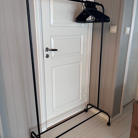 Har 2 stk av disse klesstativene, til å henge på veggen. I stål. Veldig praktiske, da de har 2 høyder med heng. Litt rust, som kan pusses lett og evt lakkes. Blir nok fine å lakke i svart Bengalack. Må hentes på Solløkka i Sandefjord. Kr 100,- pr stk.