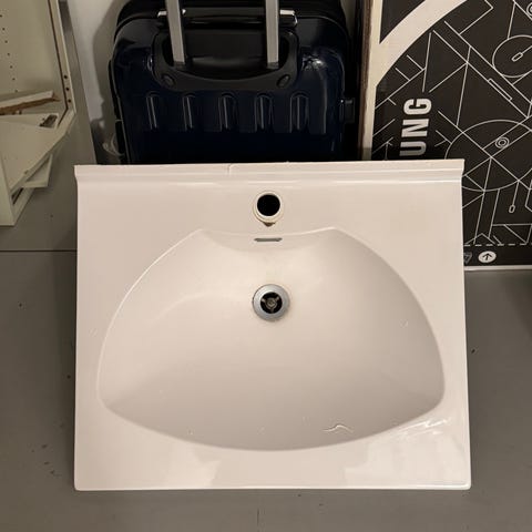 Heritage servant i hvitt porselen med søyle som skjuler rør/avløp. Designet med to små fordypninger på hver side av bassenget for plassering av såpe eller annet. Liten overflateskade i porselenet.