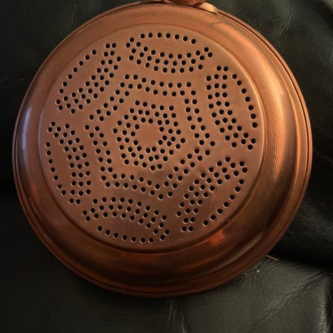 Dekorasjonsgryte i "kobber" med hengende håndtak. Gryten har en rustikk finish og kan brukes som dekorasjon i hjemmet, på hytten eller andre steder.