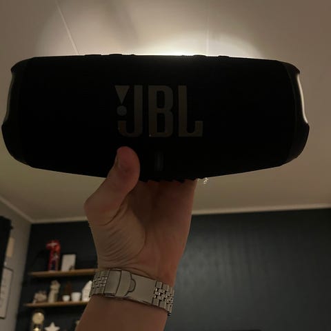 JBL Flip 6 trådløs høyttaler i svart farge. Bærbar design med integrerte kontrollknapper for avspilling og volum. Egnet for bruk med Bluetooth-kompatible enheter.