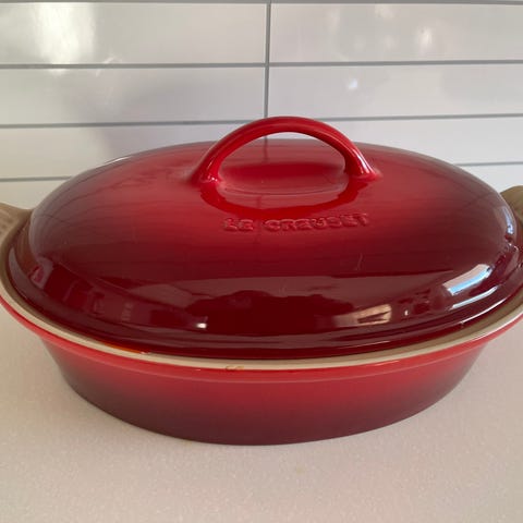 Selger en original Le Creuset bakebolle på 4,7 liter i den klassiske fargen Cerise (rød). Bollen er laget i kraftig steingods med lys emalje på innsiden.