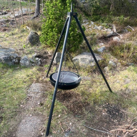 Bålrigg som leveres med oppheng og rist. Risten kan justeres trinnløst, og kan også taes av for oppheng av kaffekjele. Denne bålriggen ble vårt valg da vi skulle ut på tur. Testet med tre kjeler, hvor den største var en stor jerngryte med en nydelig hjortegryte for 6 personer.