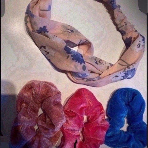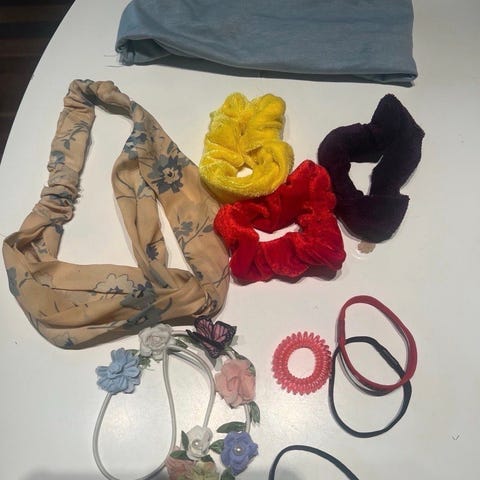 Pakke med ulike hårtilbehør bestående av flere scrunchies i forskjellige farger og mønstre, samt hårklemmer i ulike størrelser og farger. Produktene er laget av tekstilmaterialer og plast, egnet for å holde og style hår.
