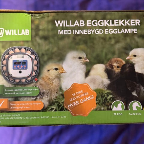Willab Eggkläckare med inbyggd ägglampa. Utstyrt for klekking av egg, med funksjon for å lyse gjennom eggene for inspeksjon. Brukt 2 ganger, Kr 1500
