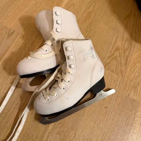 Hvite kunstløpskøyter i størrelse 30, egnet for skøytesport. Skøytene har tradisjonelt design med snøring og metallklinger. Passer til barn som ønsker å gå på skøyter.