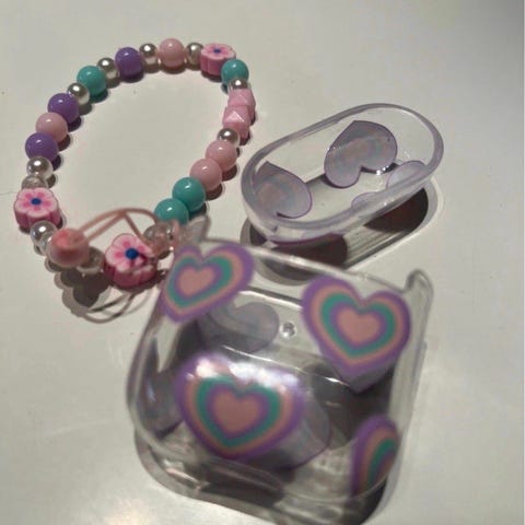 Apple AirPods etui med gjennomsiktig design og flerfargede hjerter. Inkluderer et dekorativt perlearmbånd i rosa, lilla og turkis farger. Egnet for beskyttelse og personlig tilpasning av AirPods Pro.