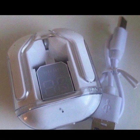 Trådløse ørepropper med ladeetui som viser digitalt batterinivå. Leveres med USB-ladekabel. Farge: svart og hvit.