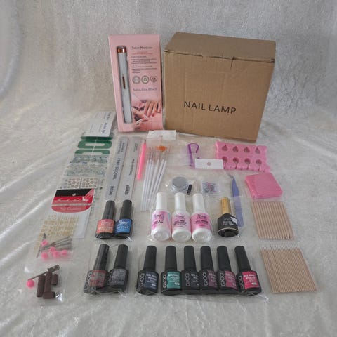Nails Inc. neglepleie sett som inkluderer UV-lampe, neglelakk, neglefil, neglebåndsverktøy, og diverse tilbehør for neglepleie. Produktet er egnet for hjemmebruk og inneholder flere komponenter til neglebehandling.
