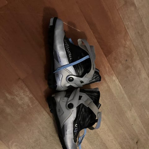 Alpina skisko i svart, med blå og hvite farger. Skiskoene har snøring og gummisåle med godt grep. Skoene har standard langrenn feste.