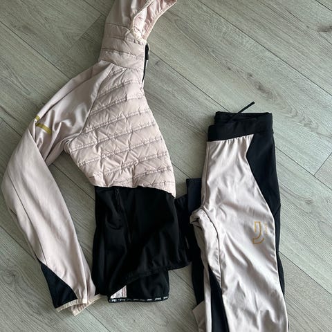 Johaug skidress med jakke og bukse. Jakken er i str M og har en liten rift under stoffet som ikke ses ved bruk, kan enkelt sys. Buksen er i str S og er pent brukt.